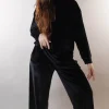 Coupe Contemporaine : Le haut présente un col rond et des épaules tombantes pour un style “oversize” assumé. Le bas est un pantalon large et fluide qui flatte toutes les morphologies.
